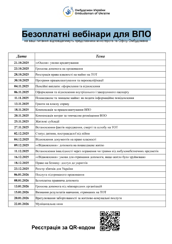 У рамках співпраці Секретаріату Уповноваженого Верховної Ради України з прав людини та громадської організації "Відродження України 2022", за підтримки Офісу Ради Європи в Україні заплановано організацію та проведення онлайн вебінарів для внутрішньо переміщених осіб та осіб, які постраждали від збройної агресії проти України.