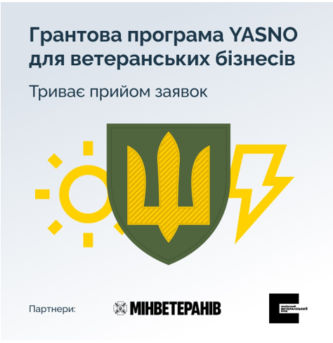 Триває приймання заявок на грантову програму для ветеранського бізнесу від YASNO. Переможцям програми компенсують кошти, сплачені за 30 тис. кВт∙год, що дасть змогу зекономити близько 300 тис. грн. Проєкт реалізується за підтримки Українського ветеранського фонду Мінветеранів.
